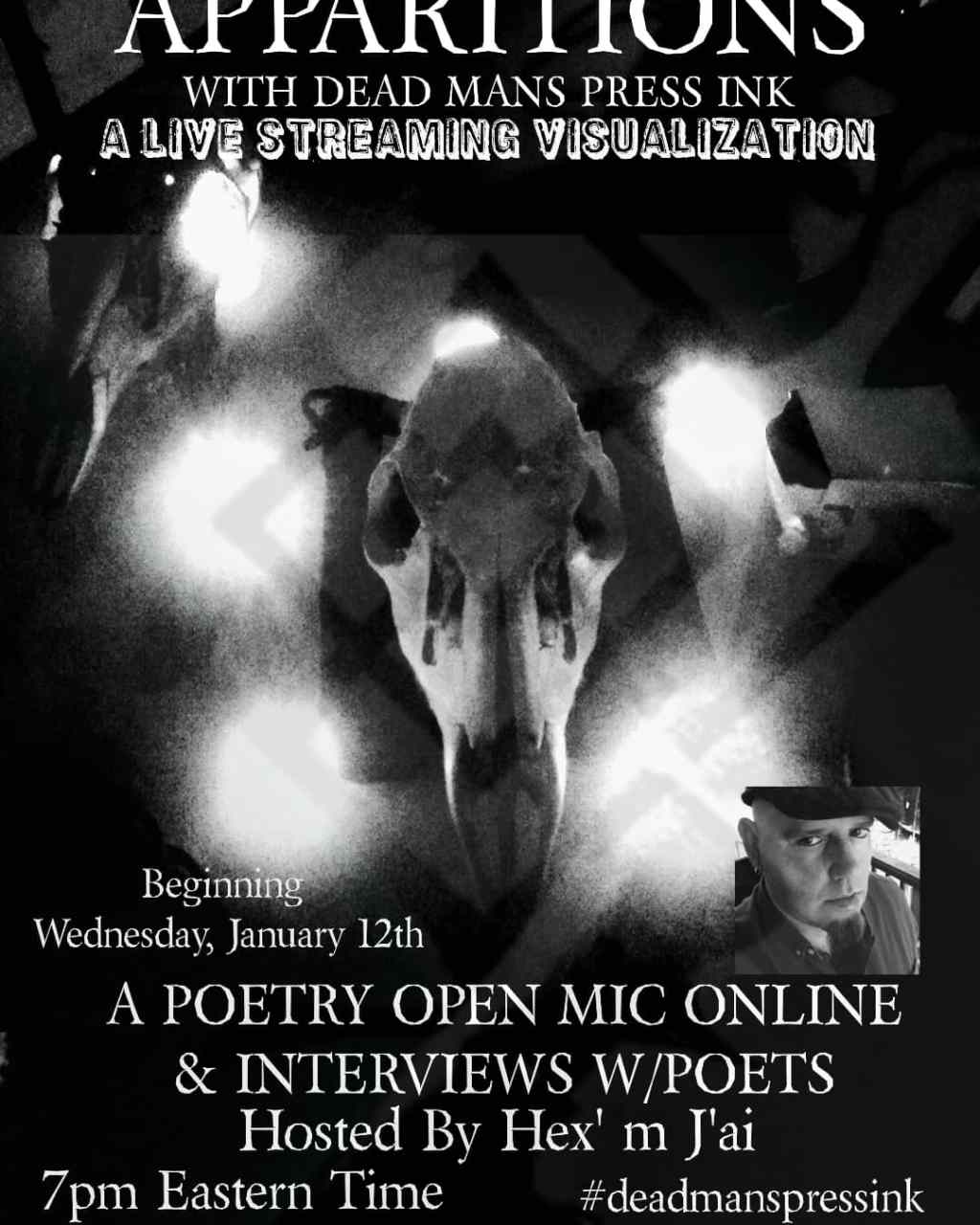 DEAD MAN’S PRESS INK is excited to announce our brand new sister poetry open mic “APPARITIONS” which will be kicking off on Wednesday, January 12th 2022. Hosted By the Co-Editor of DEAD MAN’S PRESS INK, HEX’ M J’AI this unique, live streaming open mic will feature interviews with authors & poets as well as a virtual reading which is open to all writers and poets all over. The start time will be at 7pm Eastern Standard Time and we will have more news forthcoming.